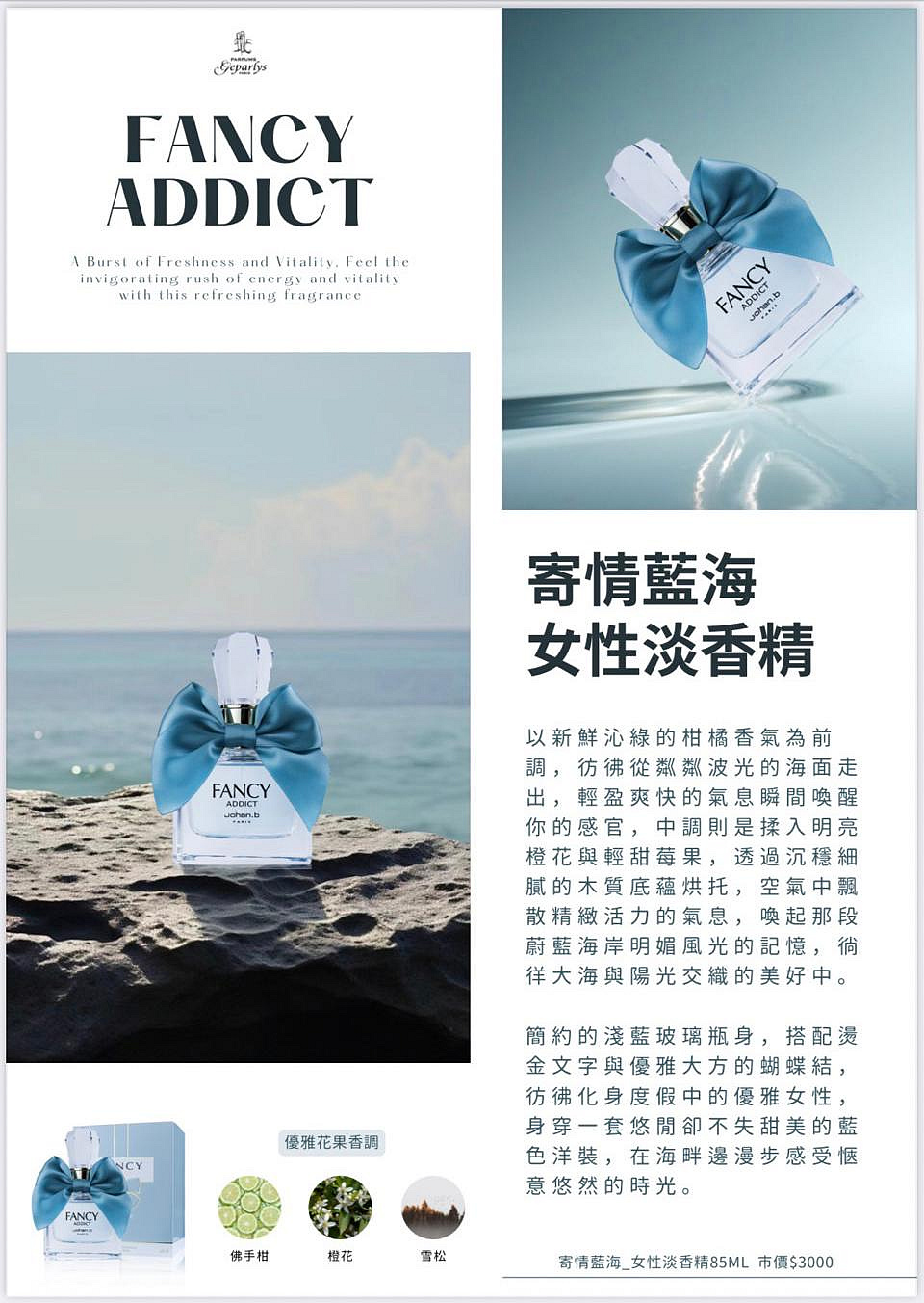 輕盈爽快的氣息瞬間喚醒你的感官,中調則是揉入明亮橙花與輕甜莓果