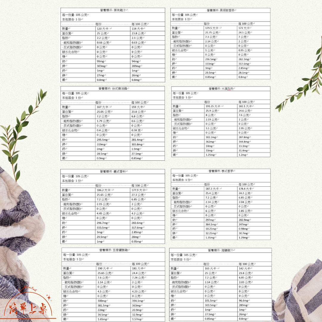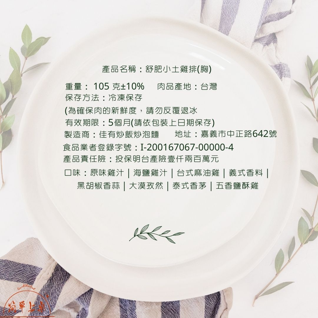 義式香料:土雞胸、海鹽、雞油(蒜頭、薑、紅蔥頭、月桂葉、花椒粒)、義式香料粉(牛膝草、奧勒岡、迷迭香、百里香、羅勒、薄荷、月桂葉、鼠尾草)、蒜粉ˋ黑胡椒