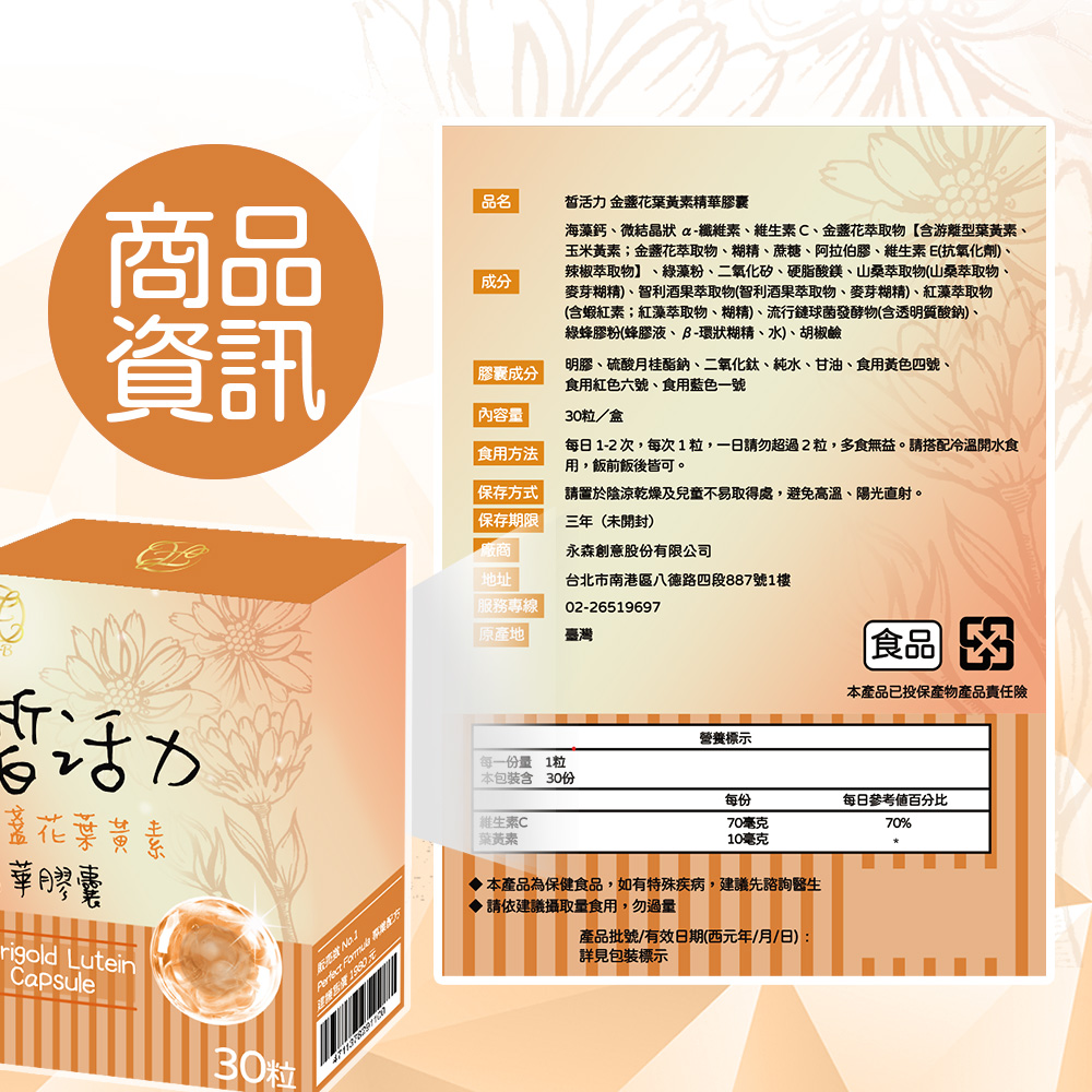 🔸食品成分:海藻鈣、微結晶狀 α-纖維素、維生素C、金盞花萃取物(含游離型葉黃素、玉米黃素)、糊精、蔗糖、阿拉伯膠、維生素E(抗氧化劑)、辣椒萃取物、綠藻粉、二氧化矽、硬脂酸鎂、山桑萃取物、麥芽糊精、智利酒果萃取物、紅藻萃取物(含蝦紅素)、流行鏈球菌發酵物(含透明質酸鈉)、綠蜂膠(蜂膠液、β-環狀糊精、水)、胡椒鹼