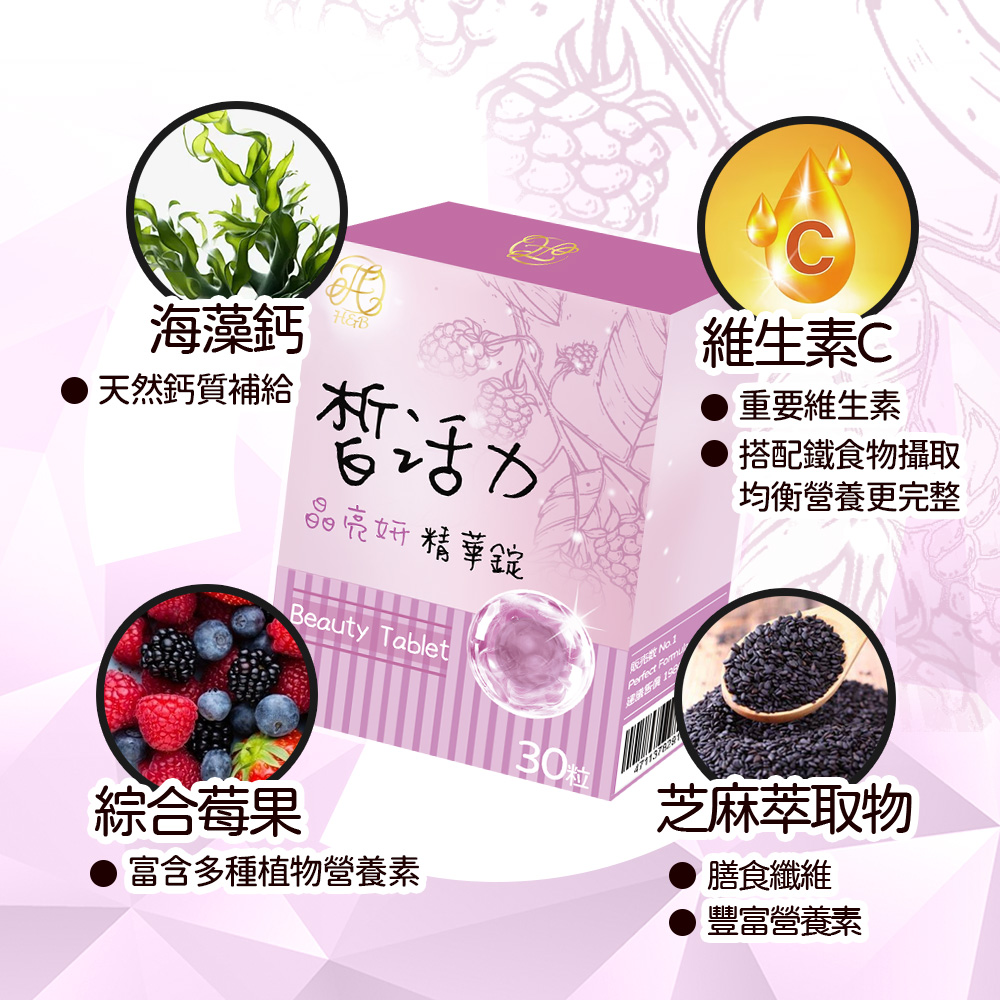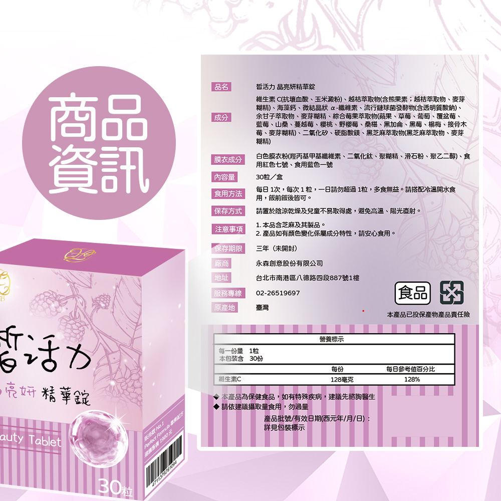 🔸成分:維生素C(抗壞血酸、玉米澱粉)、越桔萃取物(含熊果素、麥芽糊精)、海藻鈣、微結晶狀 α-纖維素、流行鏈球菌發酵物(含透明質酸鈉)、余甘子萃取物、麥芽糊精、綜合莓果萃取物(蘋果、草莓、葡萄、覆盆莓、藍莓、山桑、蔓越莓、櫻桃、野櫻梅、桑葚、黑加侖、黑莓、楊梅、接骨木莓、麥芽糊精)、二氧化矽、硬脂酸鎂、黑芝麻萃取物