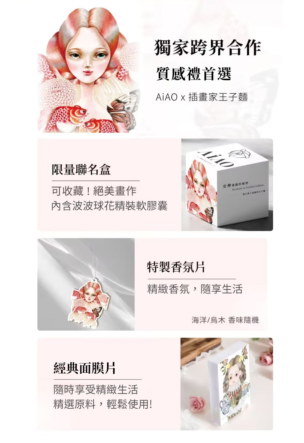 AiAO 與插畫家王子麵跨界合作推出「愛的童顏密碼」聯名禮盒。