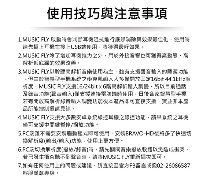 6.PC端切換解析度(撥放/錄音)時,請先關閉音樂撥放軟體以免造成衝突,若已發生衝突聽不到聲音時,請將MUSIC FLY重新插拔即可。