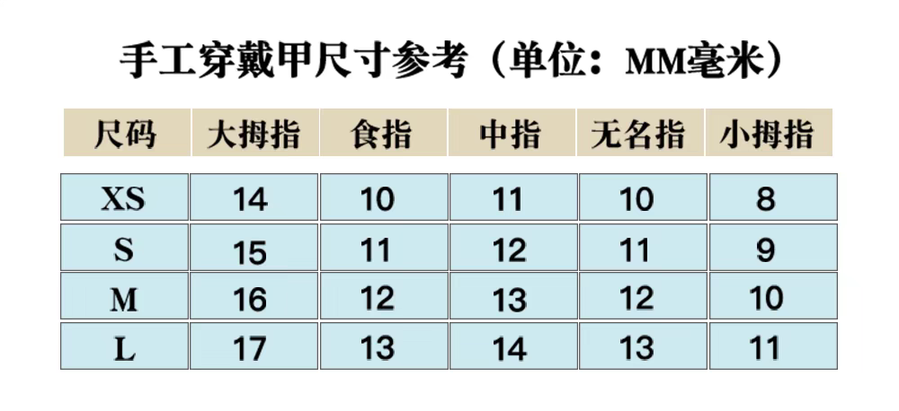 請測量自己本甲(裸甲)最寬處的寬度,依照尺寸表選擇相應的尺碼,若選不到完全符合的尺碼,建議選大一碼喔,因為大了可以使用附贈的指甲銼條磨,但小了就戴不了喔! 若不清楚測量方式,請聊聊我們~