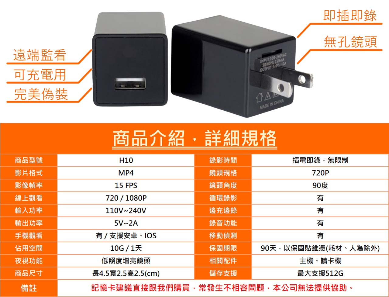H10 無孔 自動夜視 USB充電頭 插電即錄 遠程監看 針孔攝影機 監視器 微型攝影機 【寶力數位建國總店】