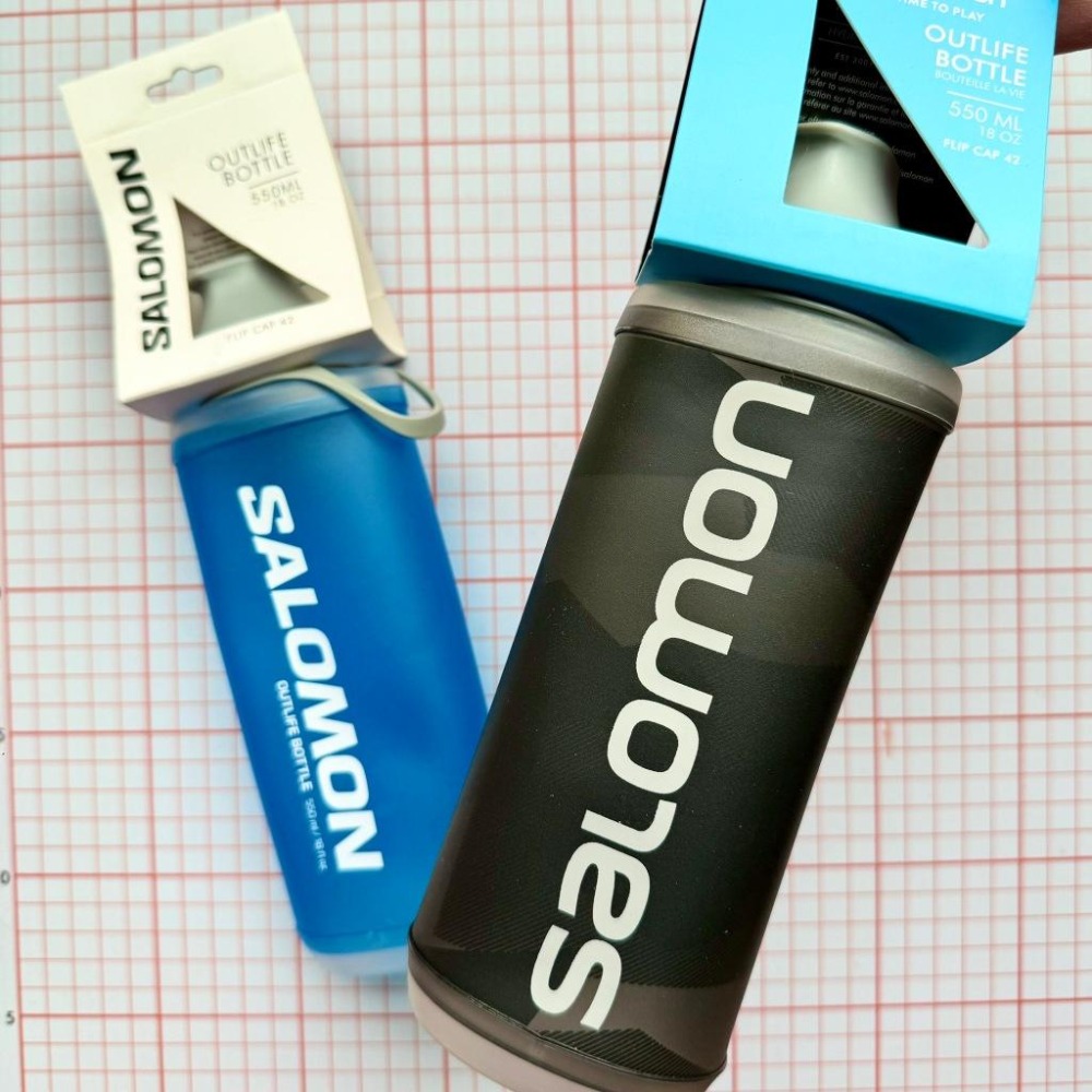 Salomon Outlife Bottle的材質類似soft flasks系列,但是更耐用。 底部壓模,水瓶只要放在平面上就可以輕鬆站立(個人測試滿穩的) 旁邊的把手方便喝水或拿取,也能使裝水更輕鬆。 平口是42mm,開蓋搭配咬嘴 尺寸:22 x 8 x 6 長 x 寬 x 深(厘米) 重量:87 克 灰色帶有一點迷彩,在陽光下很特別