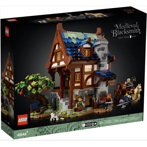 暫時抽離現代生活休息一下,拼砌這款精美的 LEGO® Ideas 中世紀鐵匠(21325)展示模型。這間三層樓的中世紀房屋以樂高風格重現迷人的建築細節。屋頂與上面 2 層樓可以掀起,便於查看設備齊全的臥室與廚房,此外還有工作坊,內部物品都是真正會出現在中世紀鐵匠舖的配備。其他特色包括會發光的熔鐵爐(附 1 個樂高發光積木)與花園(附拼砌式模型-蘋果樹和井)。 不只有人偶 此盒組有 4 個人偶讓場景活靈活現:1 個鐵匠、1 個弓箭手與 2 個黑隼武士(Black Falcon Knight),加上 4 把劍、3 面盾牌、1 支戟、1 個可擺動姿勢的馬玩偶、1 台拼砌式馬車、狗狗與樹蛙玩偶。 時髦禮品 此樂高拼砌組合是一系列有啟發性的樂高盒組之一,專門設計幫大人以創意方式放鬆,是犒賞自己或給身邊樂高粉絲、休閒活動愛好者的美妙贈禮。