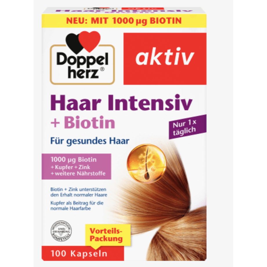 Doppelherz Haar Intensiv + Biotin 膠囊結合了維生素、微量元素、L-半胱氨酸、L-蛋氨酸和馬尾草萃取物。