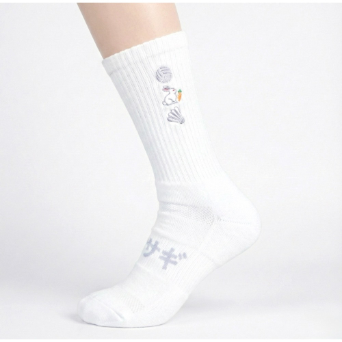 電繡羽排兔襪上架囉! 在寒冷的聖誕季節,非常適合穿上雪白的兔襪🤗 小編想問大家喜歡吃紅蘿蔔嗎?襪子上有一根電繡蘿蔔唷☺️ 排球派 羽球派 兔派 都該來一雙!