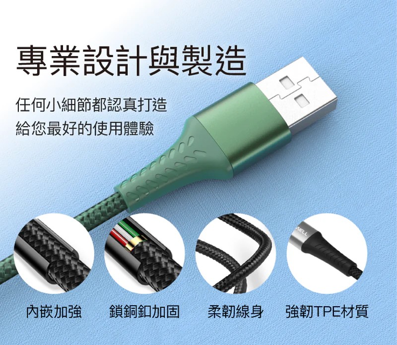 - 使用OFC無氧銅, 鋁箔+內編織屏蔽, 充電穩定, 無訊號干擾