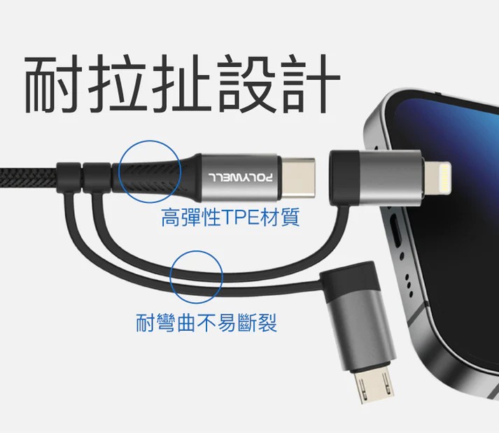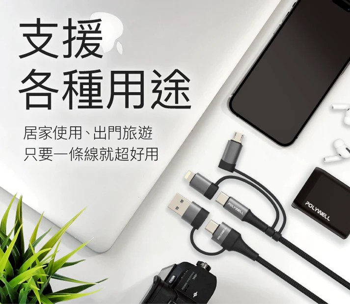 - 隨線附帶一個USB-C To Lightning轉接頭, USB-C To USB-A轉接頭, USB-C To Micro-B轉接頭, 一線五用!