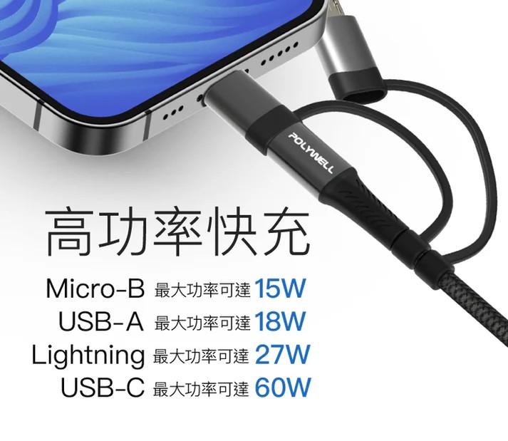 - 使用 3A 專用充電線材, 充電最大功率可達 15W (Micro-B); 18W (USB-A); 27W (Lightning); 60W (USB-C To C)
