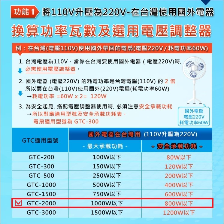 對應適用型號及安全承載功耗表,電扇適用型號為 GTC-300
