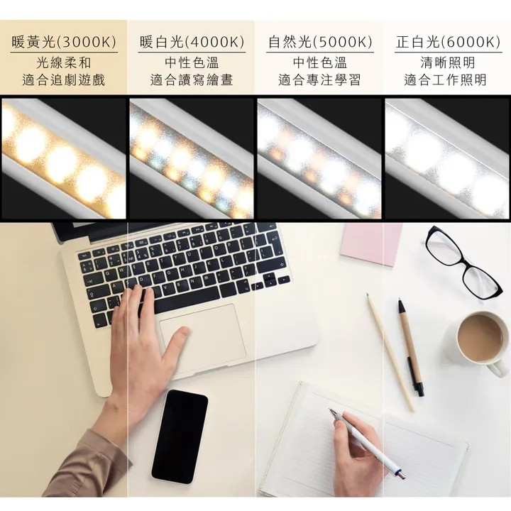 3000K/4000K/5000K/6500K四檔色溫,無段式亮度調整,斷電可記憶。