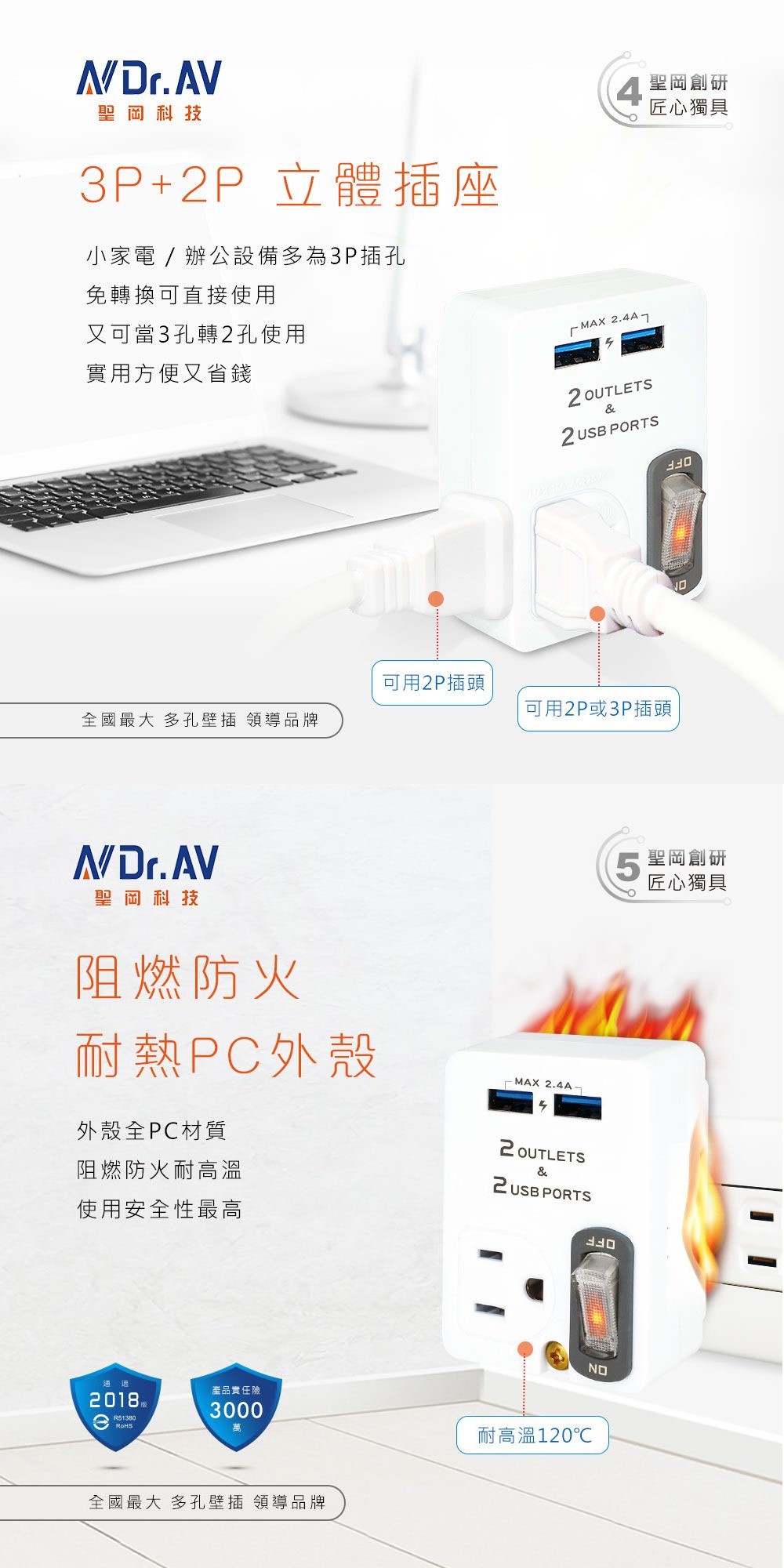 ✺1個 USB插座+ 1個 3P插座+1個 2P插座 免轉接