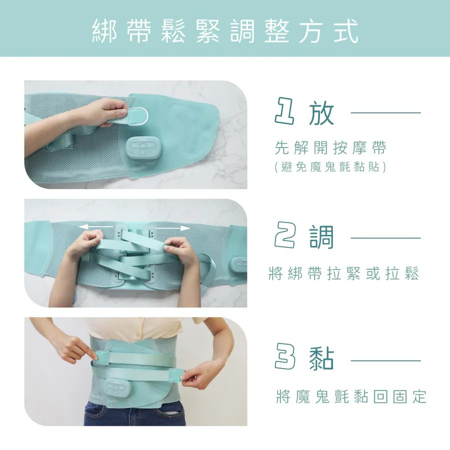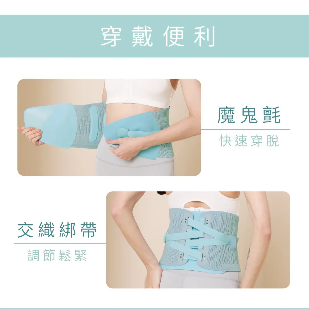 免持穿戴:黏貼帶與綁帶設計可自由調整鬆緊,並附贈延長帶,適合各種腰圍使用。