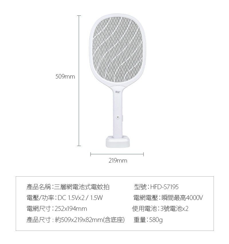 產品名稱:勳風 電池式三層網電蚊拍 HFD-S7195