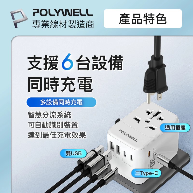 【多孔同時充電】充電器有三Type-C和雙USB埠,可以為您的旅遊設備一次同時充電