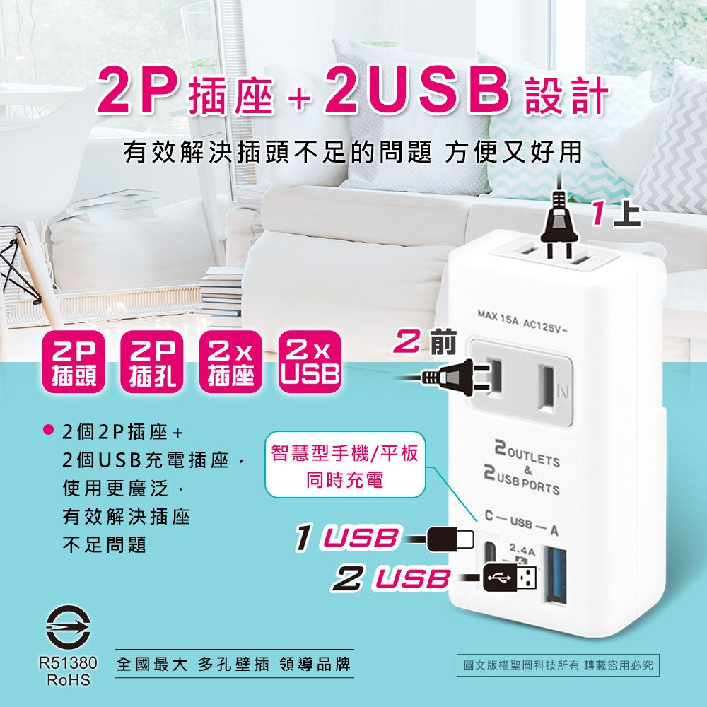 ✺2.4A 2USB 急速充電,智能分流