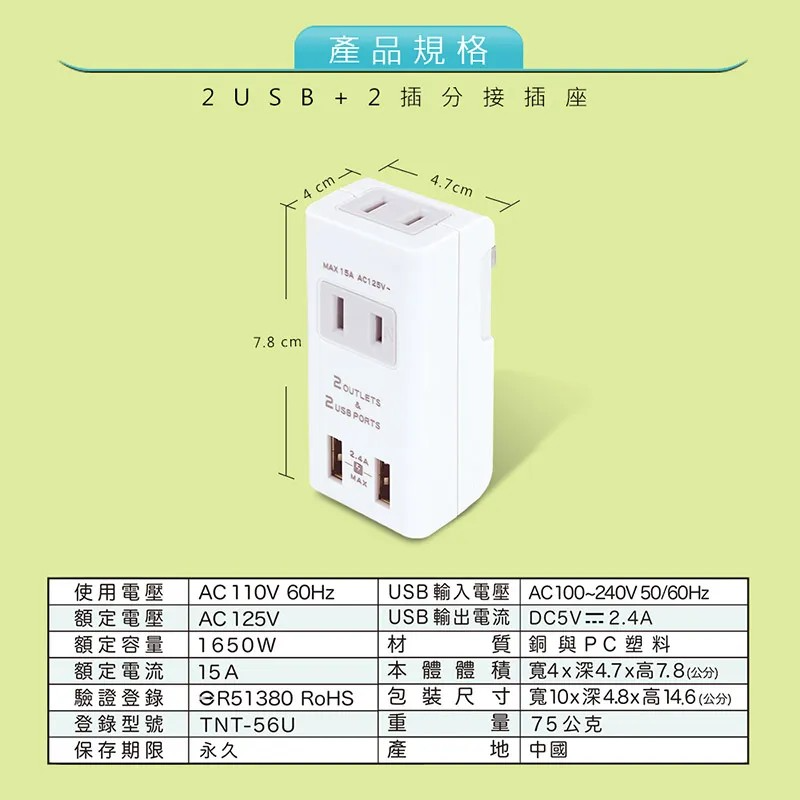 ❉ 額定電壓 : AC 125V ❉ USB輸出電流 : DC5V 2.4A