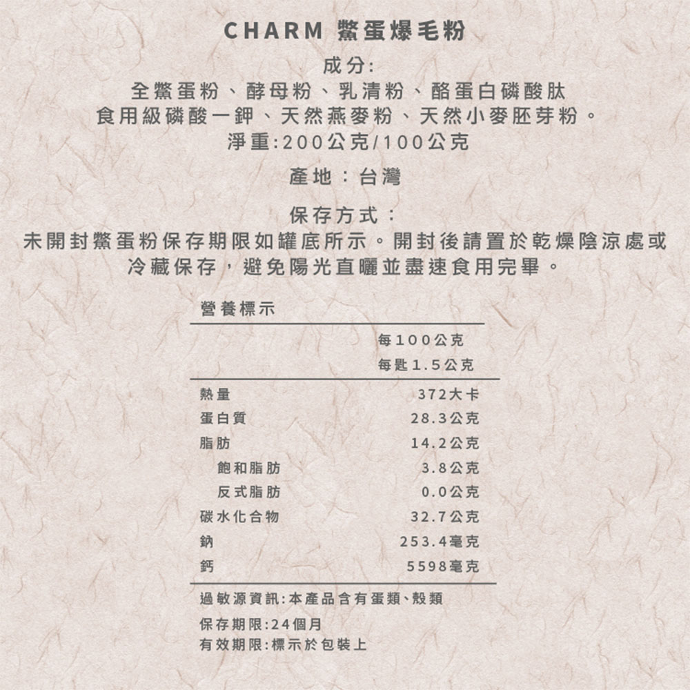 CHARM鱉蛋爆毛粉採用珍貴的鱉蛋粉製成,富含核黃素和卵磷脂。