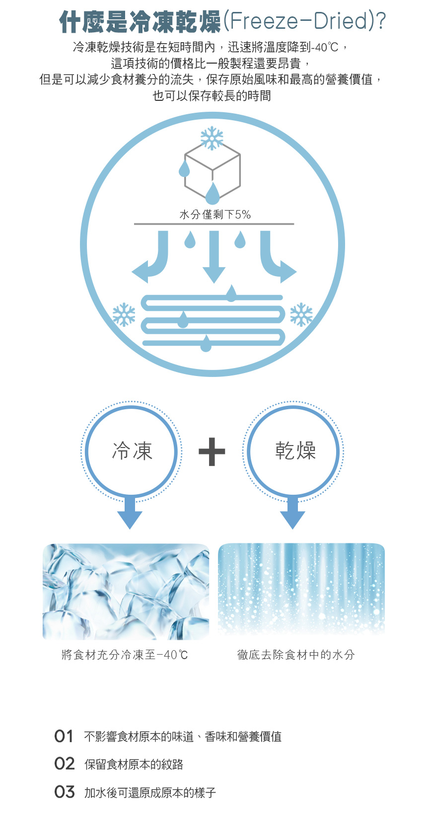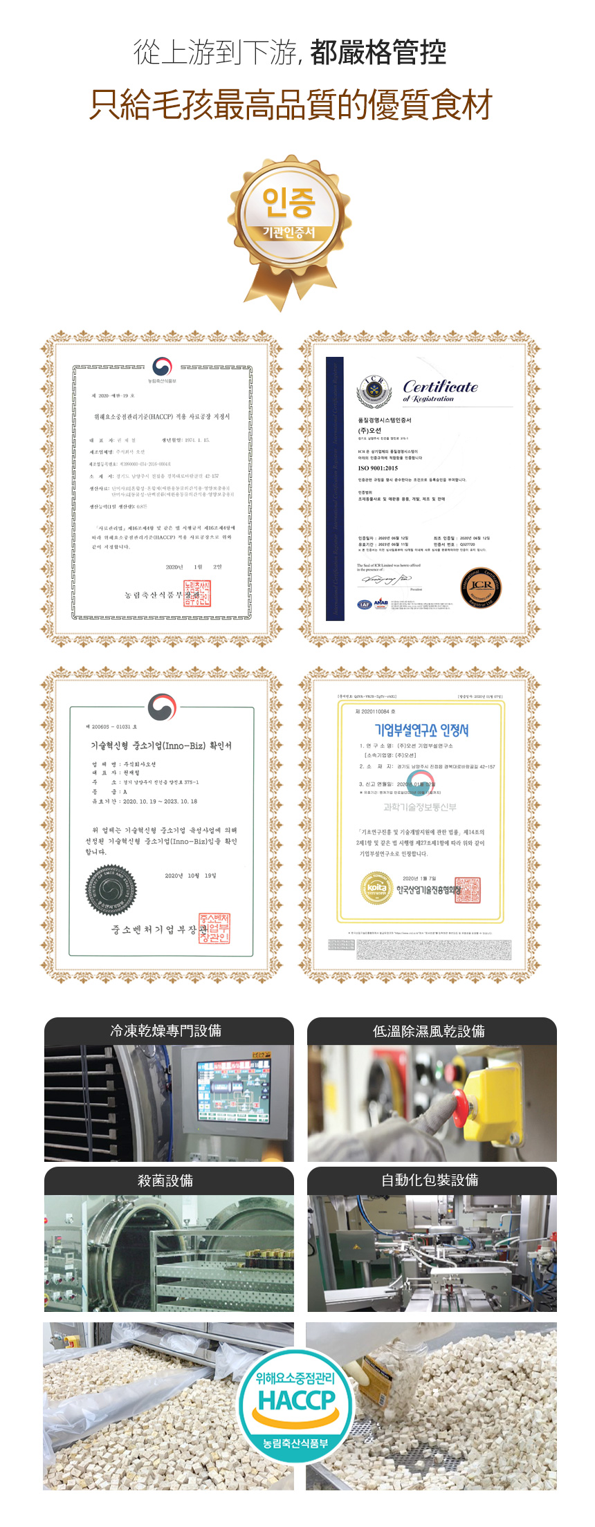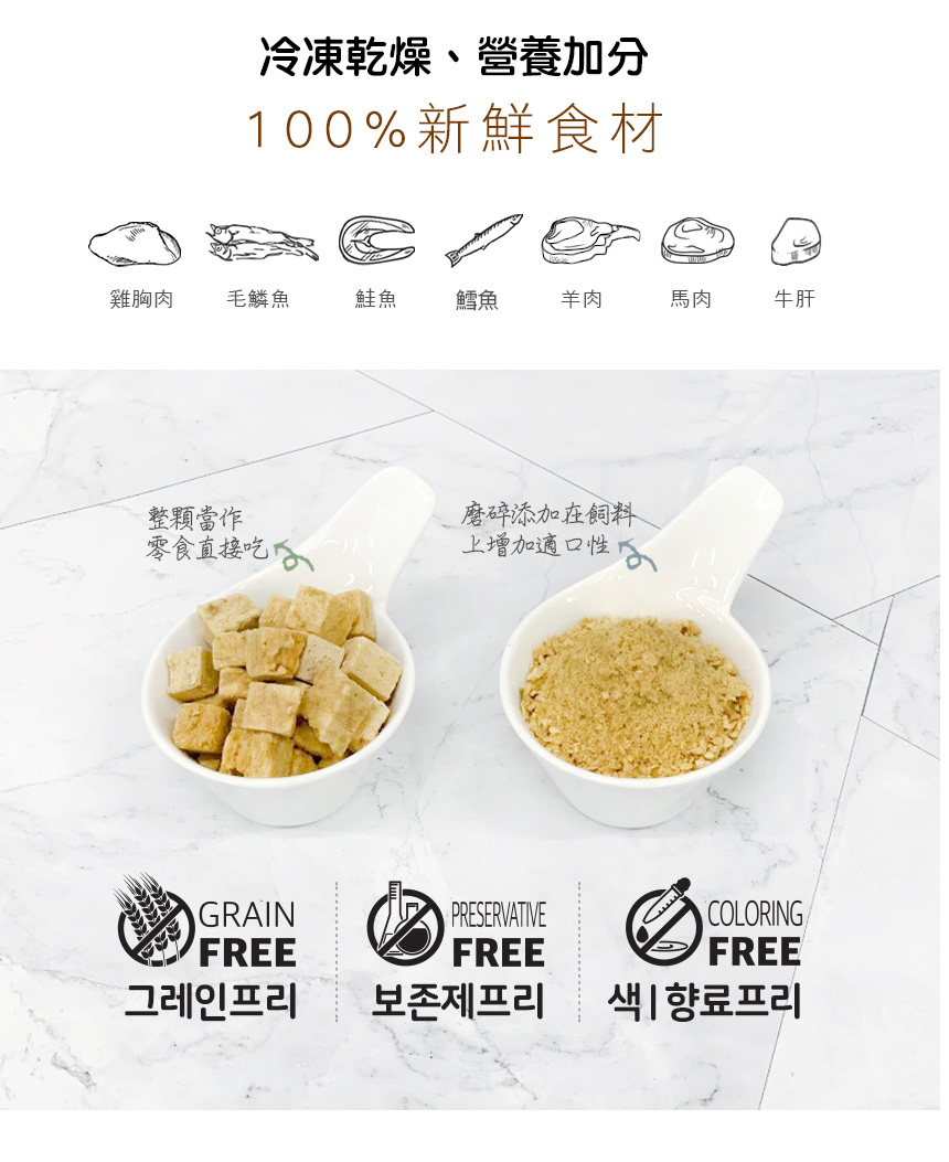 -40℃冷凍乾燥技術,保留食物完整營養價值,並用純天然食材製成,無添加防腐劑或人工色素,讓毛孩吃得安全又健康!