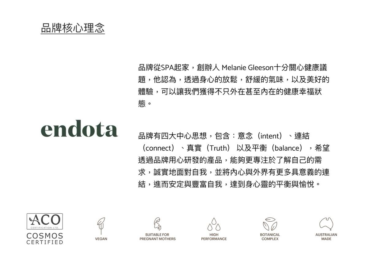治療等級的無敵滋潤感,深 入肌膚底層補水修復:護手產品最擔心滋潤但油膩無法吸收,或擦上當下保濕但很快又恢復粗糙乾燥感。endota研發此款治療等級的手部護理膏,富含多種有機天然成分,萃取超高效保濕成分,可達到深層肌膚滋潤與修復功效,幫助肌膚保濕鎖水並大大提升肌膚含水量,搭配endota經典的天然香氣組成,擦上之後絕對不只是單純的修護手部肌膚,更像是完成了一場SPA體驗,身心滿足。