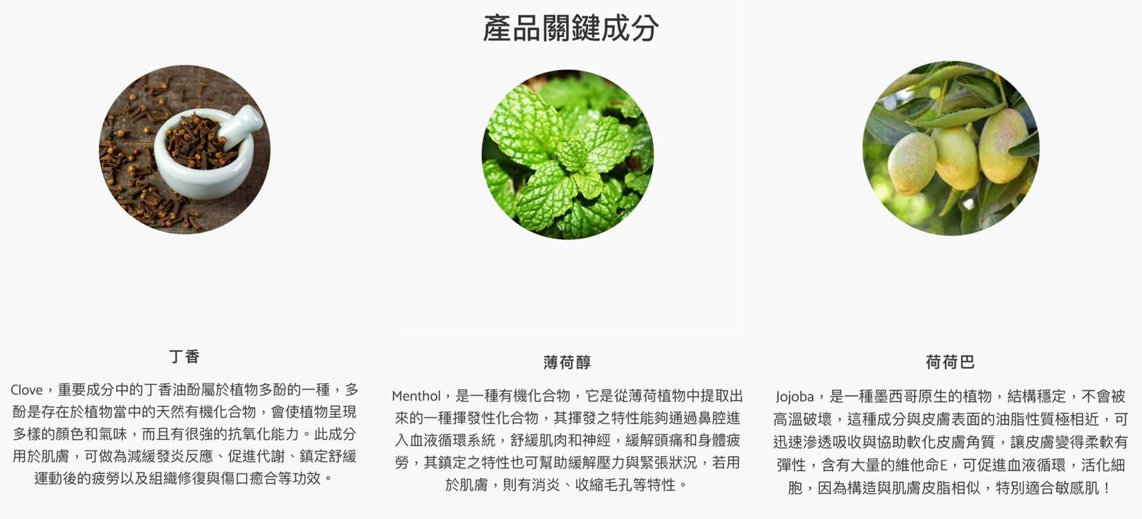 快速舒緩痠痛與修復疲勞:含有舒緩的天然成分油脂,包括薄荷、迷迭香等,此類成分具有草本及激勵的香氣,可幫助舒緩身心、減少緊張、疲勞及壓力,並加入丁香成分,可有效減緩發炎反應與促進代謝,幫助過度使用或勞累的組織達到修復的目的。