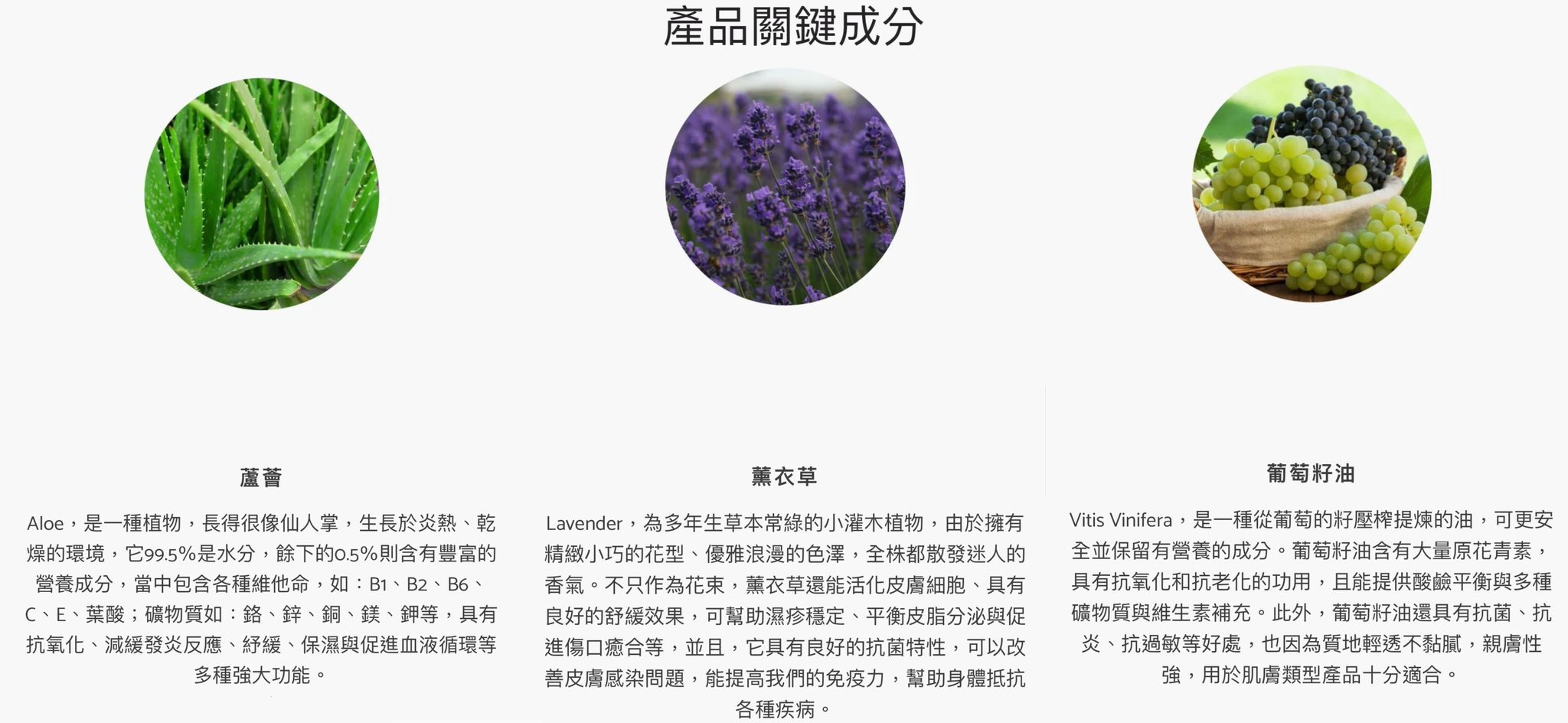 庫拉索蘆薈葉汁、甘油、香檸檬果油、薰衣草油、天竺葵油、葡萄籽油、母菊花提取物等如原廠所示。