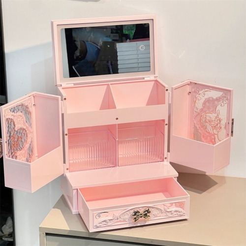 大容量分層設計化妝收納盒,搭配鏡面與多格收納空間,讓保養品、化妝品與飾品整齊收納,一盒搞定桌面凌亂。公主風外型,擺在房間也能提升質感。
