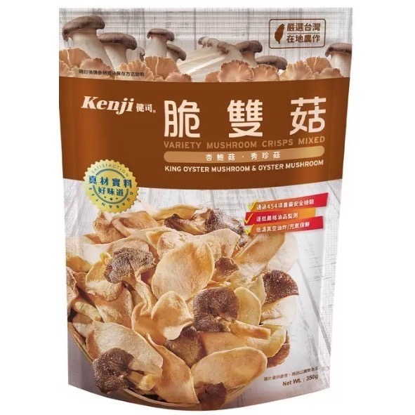 - 使用新鮮的杏鮑菇及秀珍菇切片,並採用低溫真控油炸製成,保留菇類原始風味