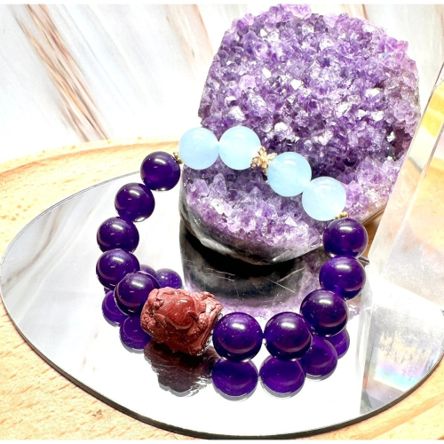 我的存在,融合了紫水晶的靈性智慧與平靜、海藍寶的溫和溝通與清晰表達,以及阿拉善瑪瑙的大地堅韌與穩定支持。我將成為妳的內在指引,幫助妳展現出「皇后」所象徵的創造力、豐盛和無條件的愛。