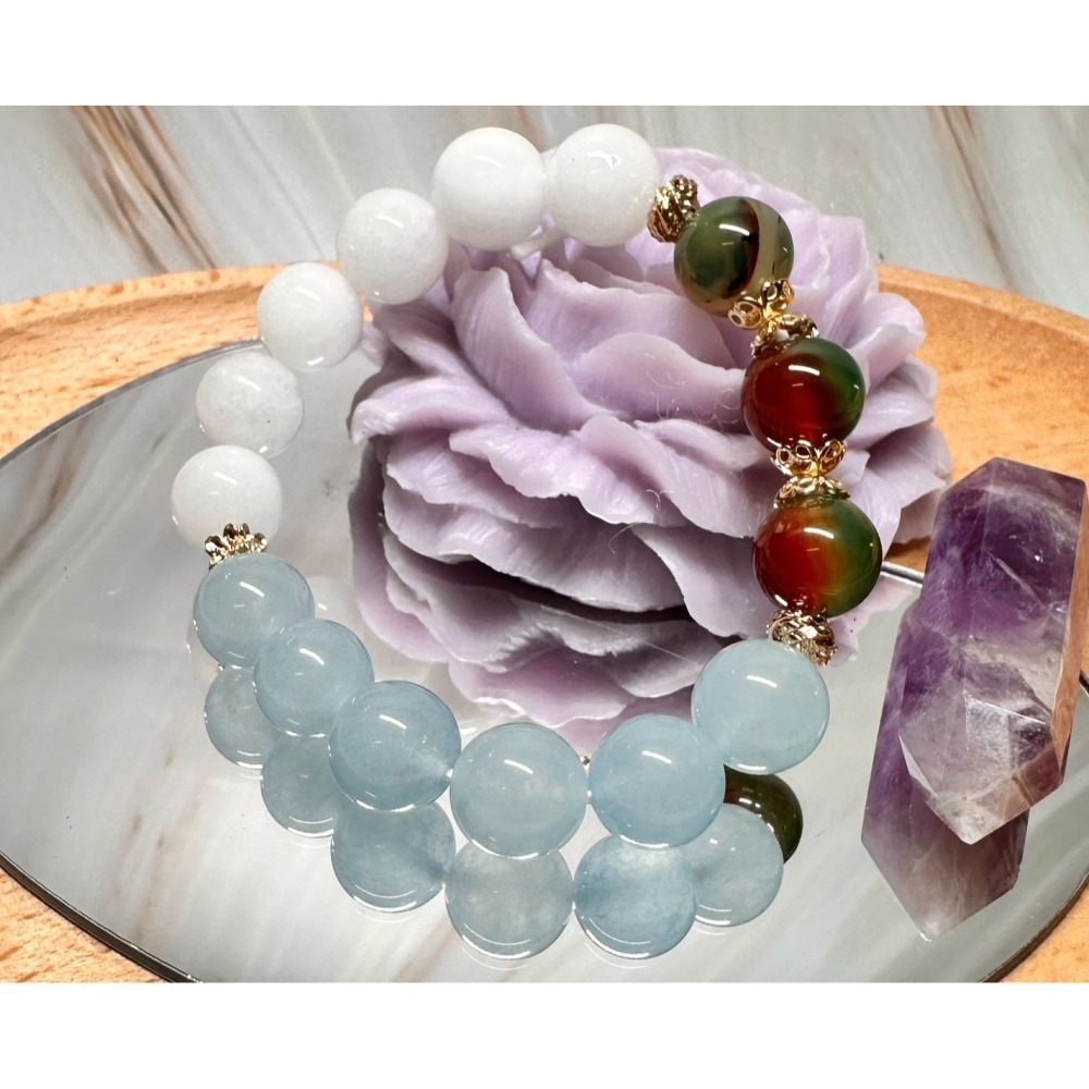 這條手鍊由白玉髓、海藍寶和孔雀瑪瑙交織而成,它蘊含著平靜、清晰溝通、自我表達以及內在智慧的能量。結合您為我抽出的那張充滿勇氣、耐心和內在力量的塔羅牌:力量,我的存在,將是您最溫柔而堅韌的盟友。