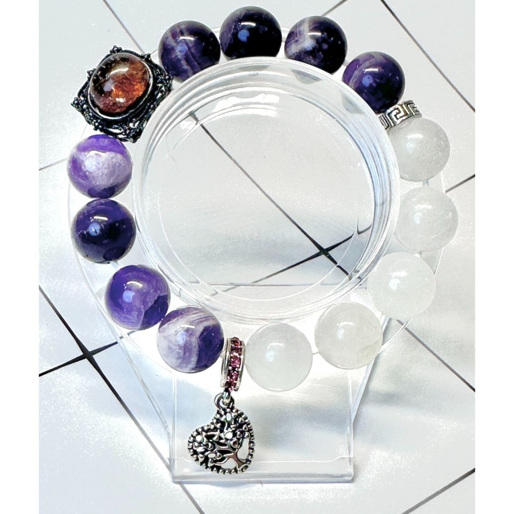這條手鍊由紫水晶、白玉髓和幽靈水晶交織而成,它蘊含著智慧、靈性連結、平靜清晰以及深層療癒與洞察的能量。結合您為我抽出的那張充滿直覺、夢境、潛意識與隱藏真相的塔羅牌:月亮,我的存在,將是您穿越迷霧,尋找內在光芒的引導者。