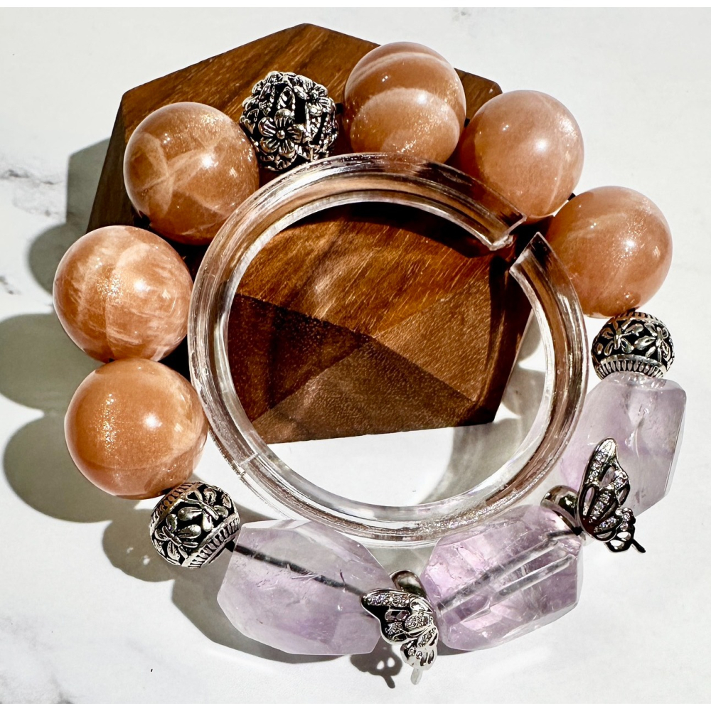 紫水晶原石與橙月光石的組合,是一條**「智慧引導、魅力加倍」**的能量手鍊: