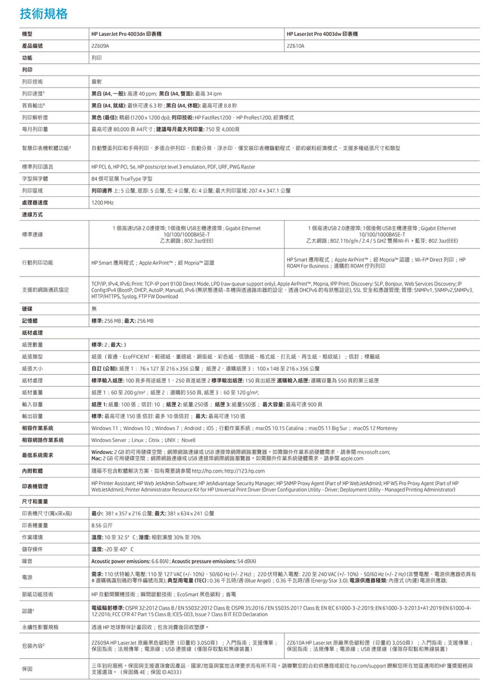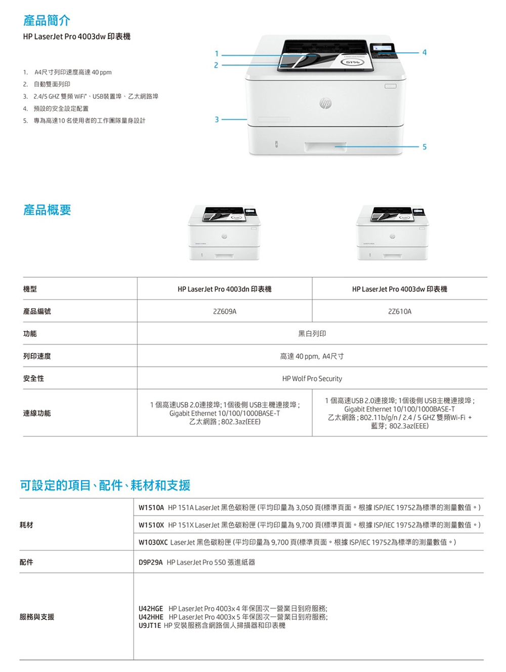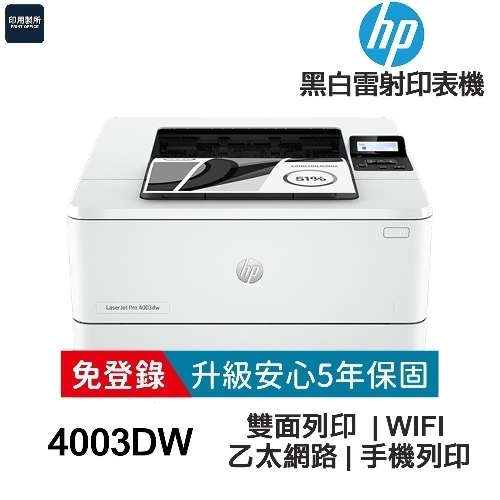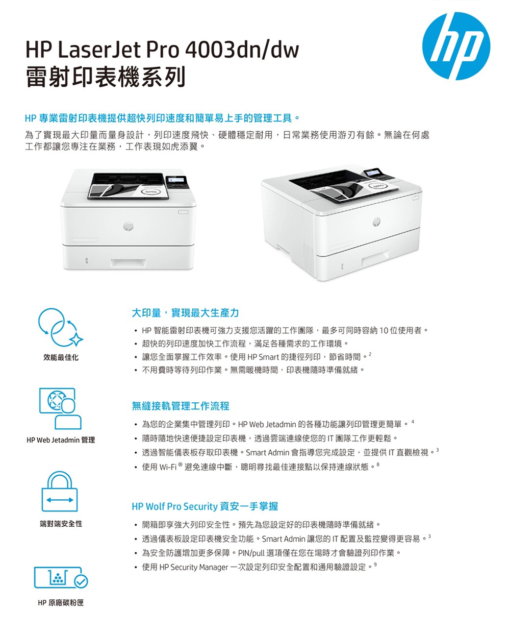 HP LaserJet Pro 4003dw 黑白雷射無線雙面印表機