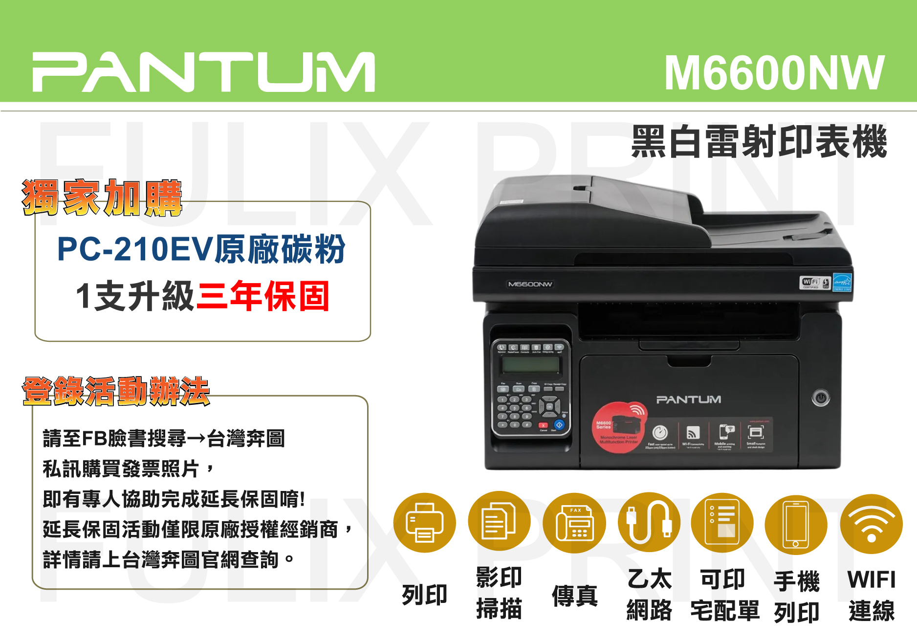 PANTUM 奔圖 M6600NW 黑白雷射傳真印表機 【含原廠碳粉匣】