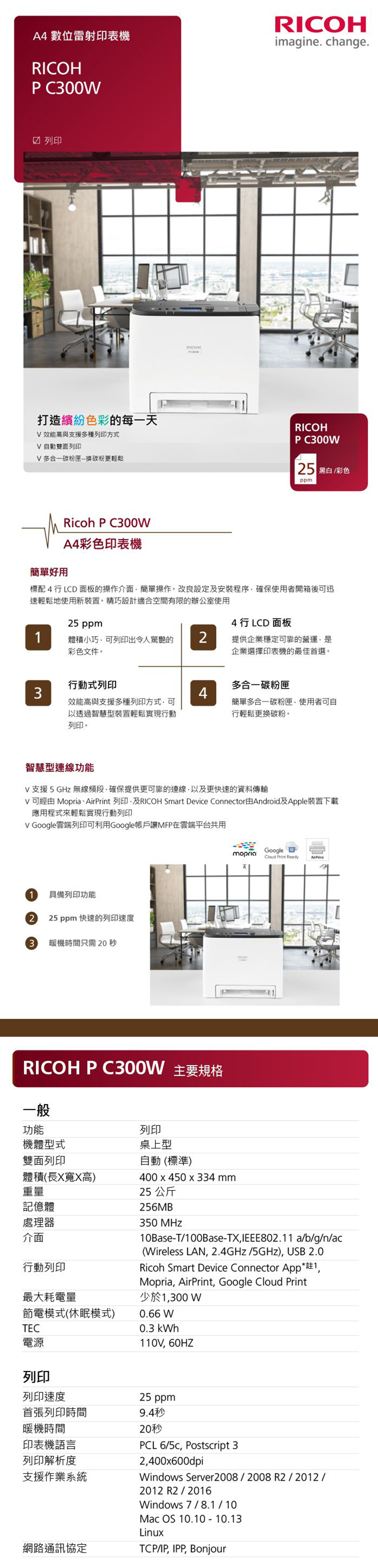 •可經由Wi-Fi Direct,Mopria、AirPrint列印,及RICOH Smart Device Connector由Android及Apple裝置下載應用程式來輕鬆實現行動列印