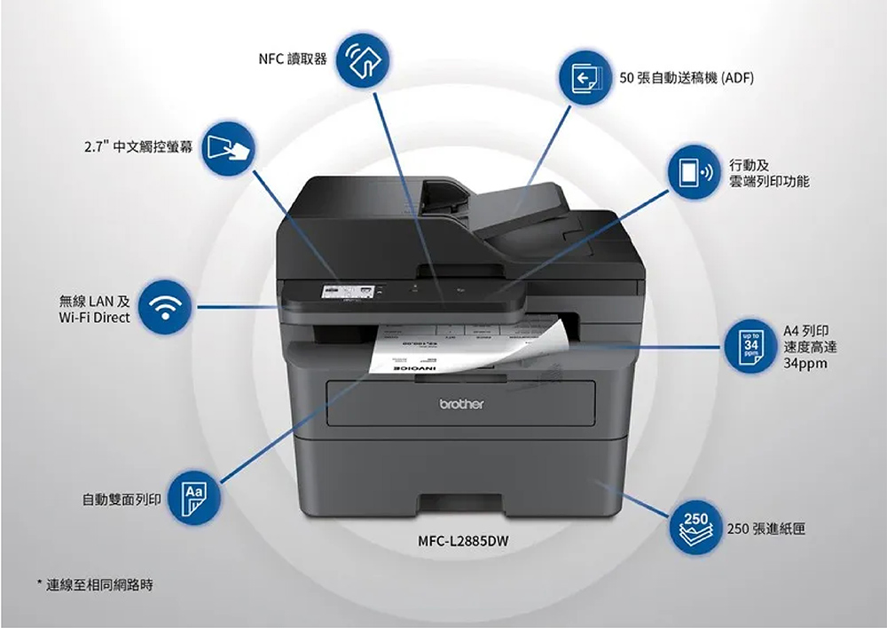 ●功能:自動雙面列印/雙面掃描/雙面複印/雙面傳真/無線網路/手機列印