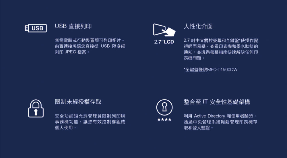 • A3自動雙面列印 / 有線網路 / 無線網路 / 行動列印