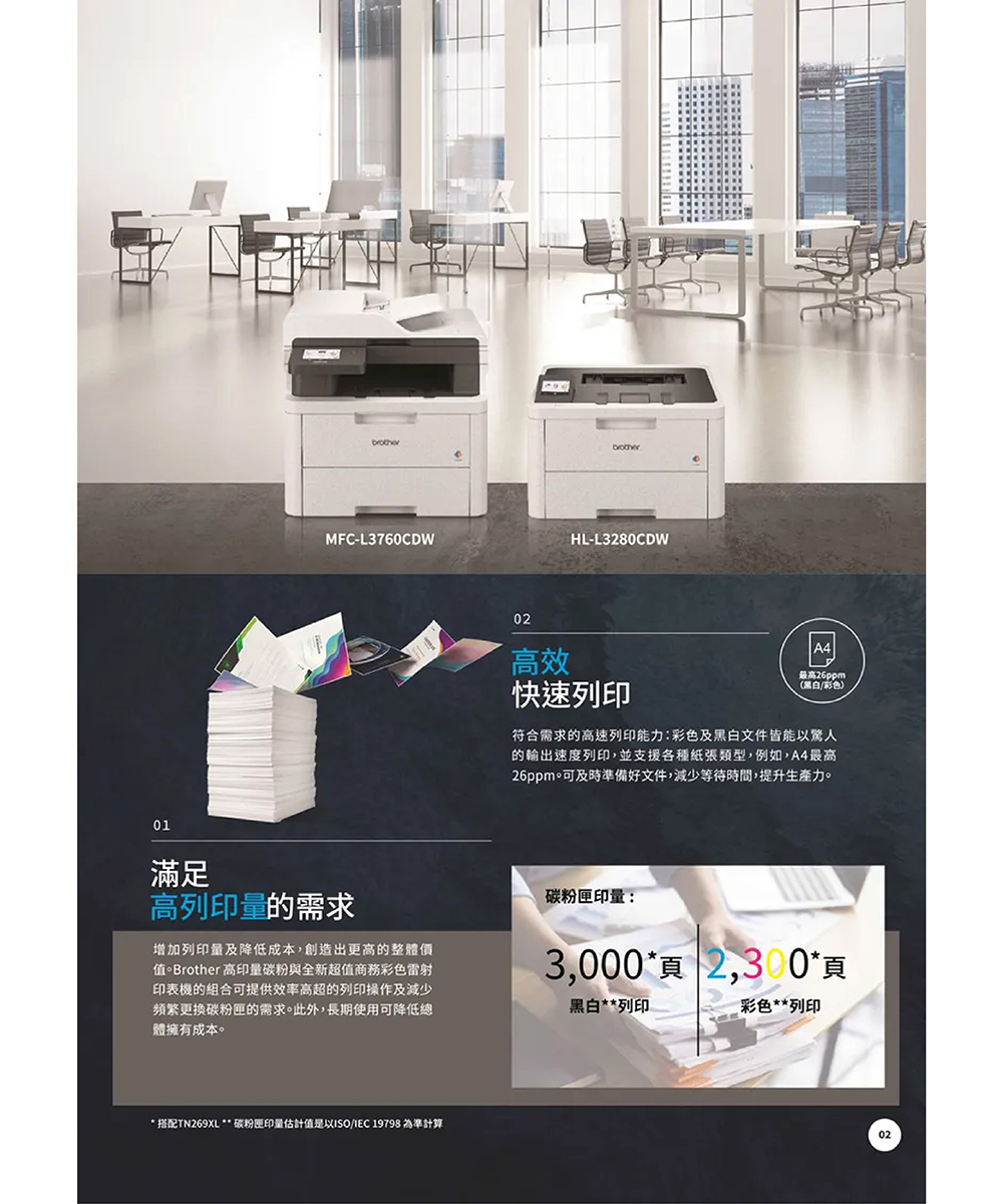 ※ 使用碳粉匣型號:TN269【A4紙張5%覆蓋率 黑1500張/彩1200張】、TN269XL【A4紙張5%覆蓋率 黑3000張/彩2300張】