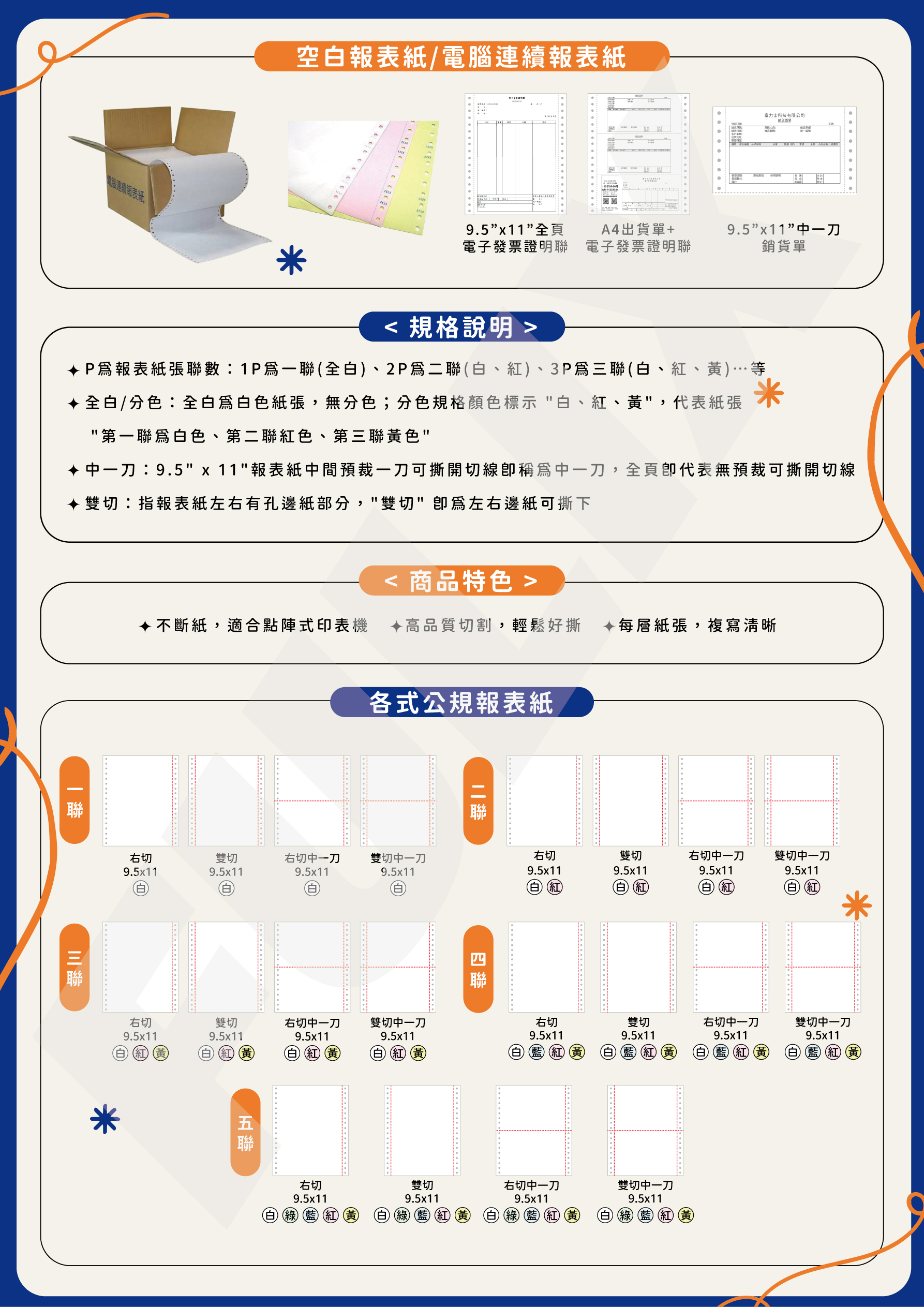 5、雙切代表:指報表紙左右有孔邊紙部分,"雙切" 即為左右邊紙可撕下