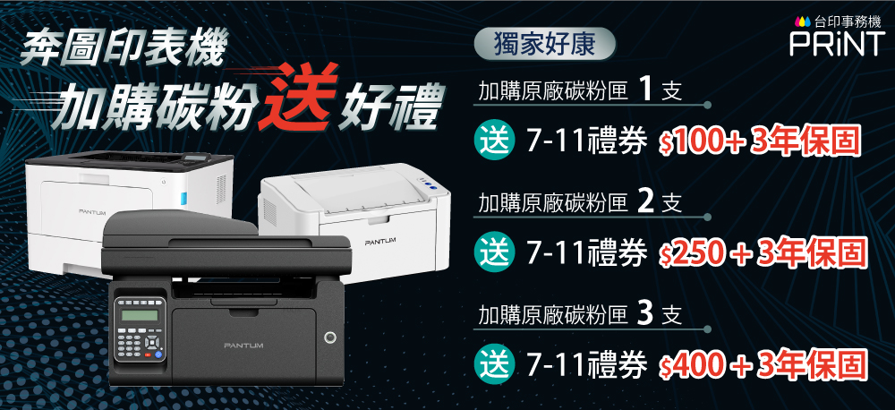 加購3支原廠碳粉 隨貨送7-11禮券$400+登錄再延長為3年保固