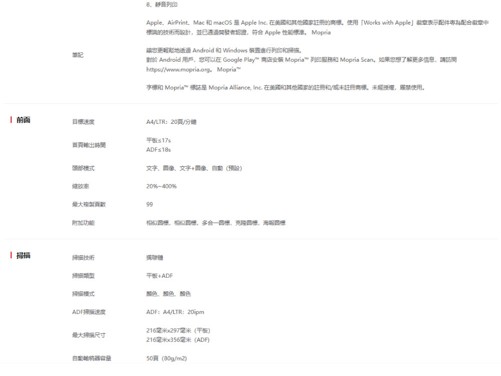 雙面列印|影印|彩色掃描|ADF連續進紙|WIFI|乙太網路|手機列印