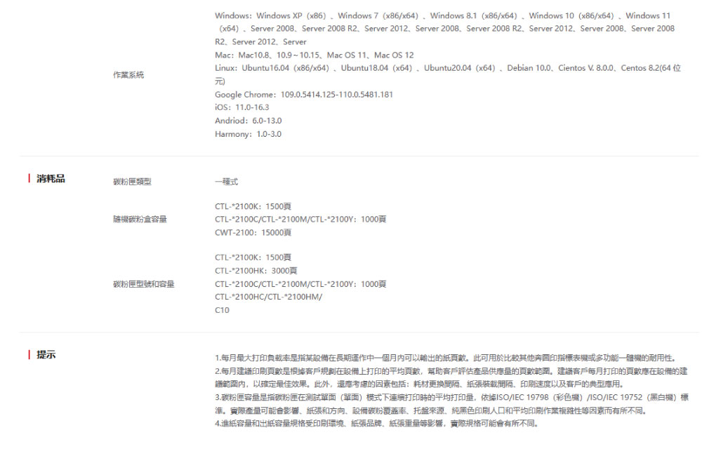 CTL2100HK 黑(3,000頁)/CTL2100HC 藍(2,500頁)/CTL2100HM 紅(2,500頁)/CTL2100HY 黃(2,500頁)
