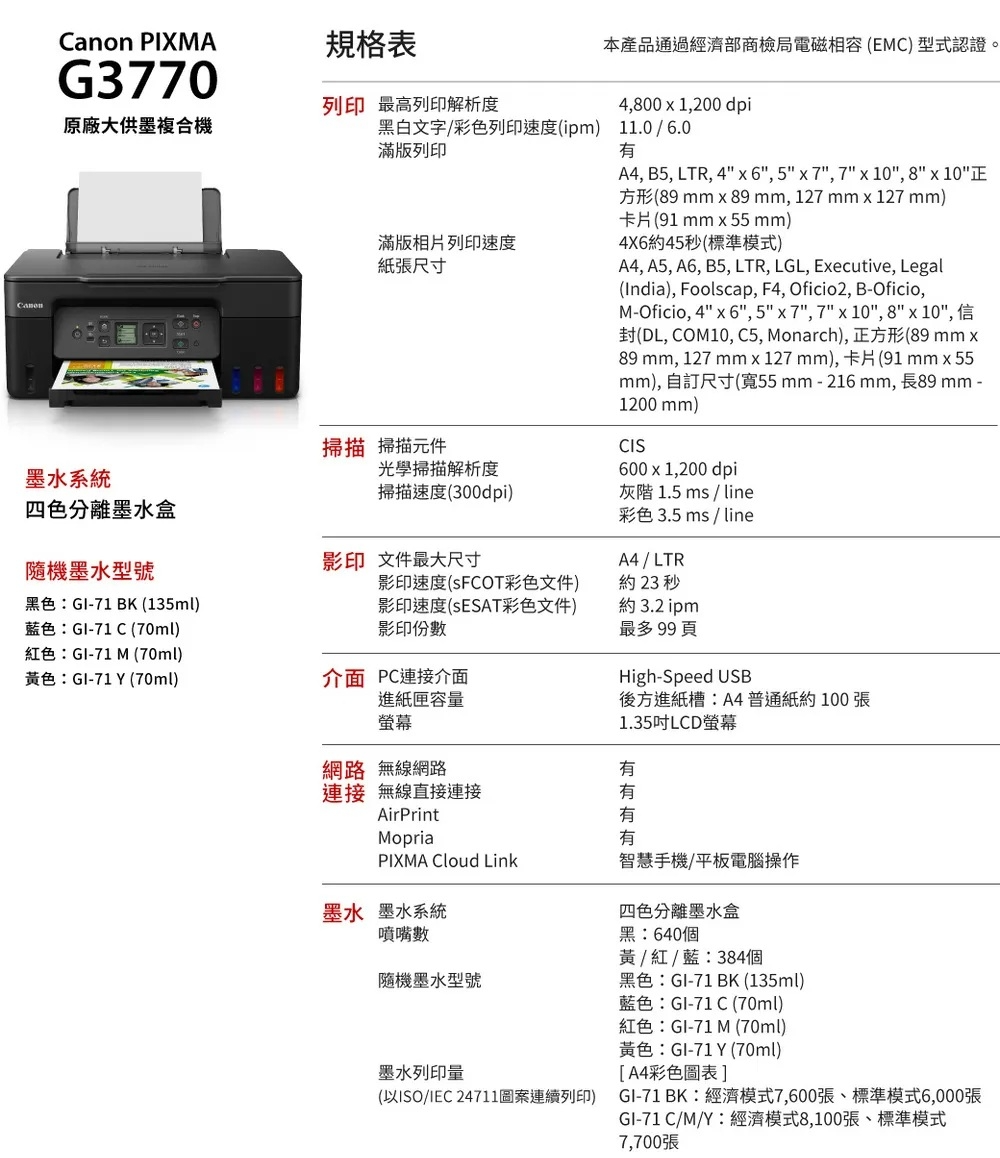 原廠GI-71(黑色135ml / 紅藍黃各70ml)