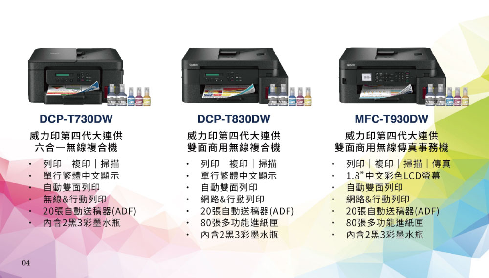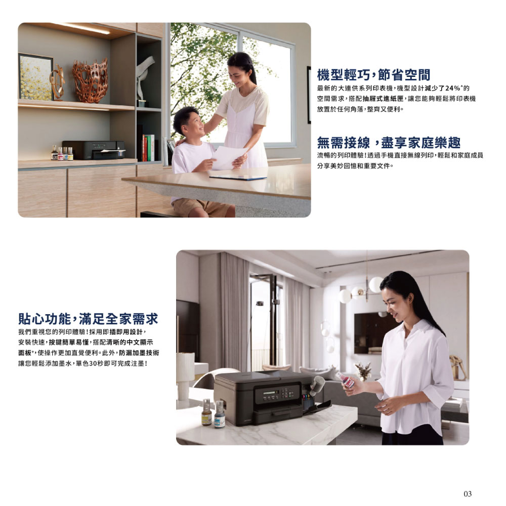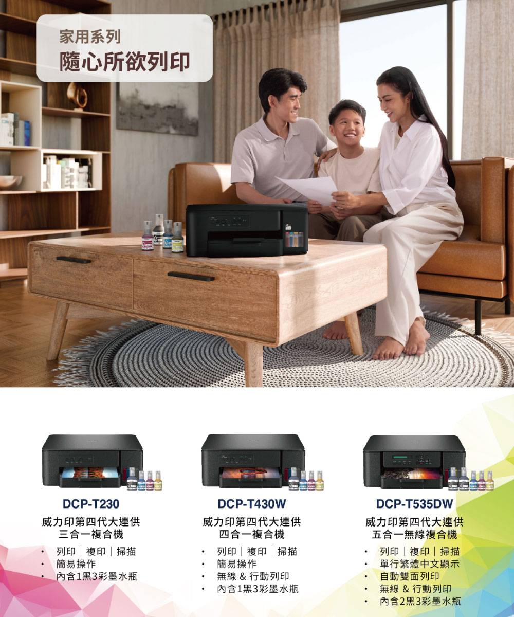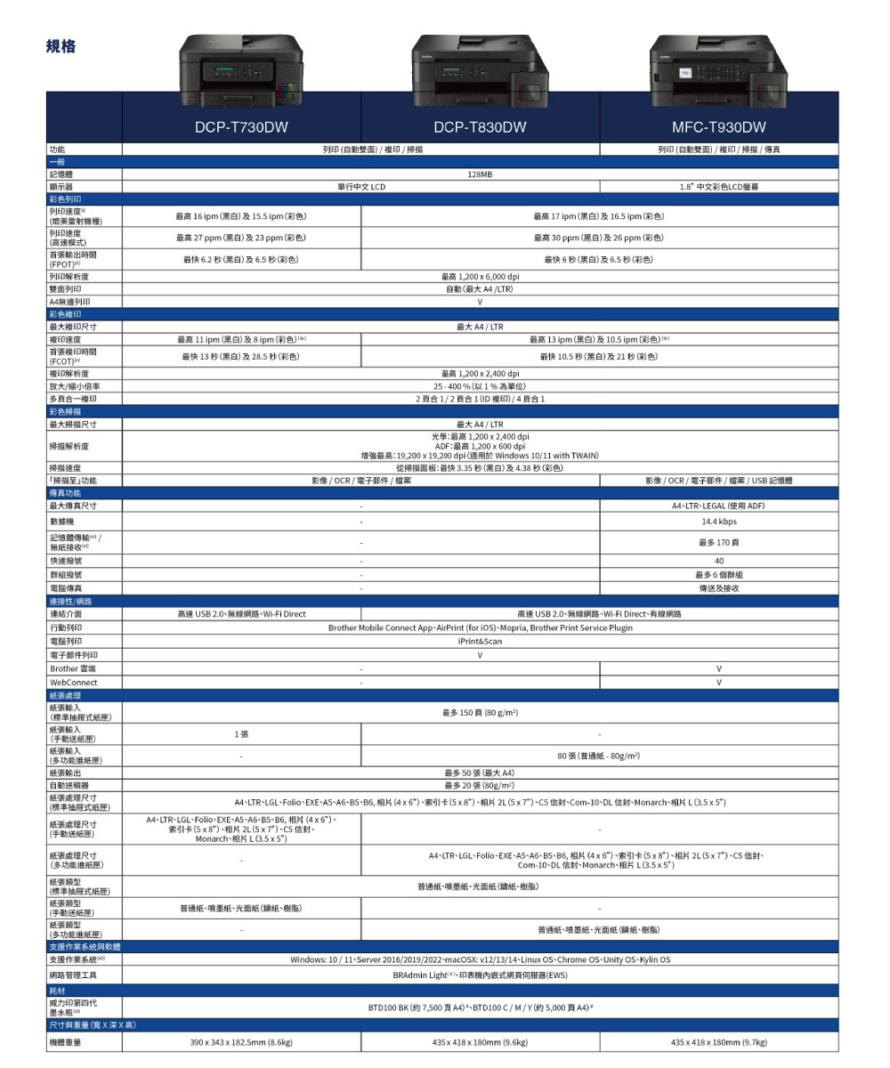 ※ 墨水匣型號:黑 BTD100 BK(A4紙張5%覆蓋率 7500張)+ 彩 BTD100 C / M / Y(A4紙張5%覆蓋率 各 5000張)
