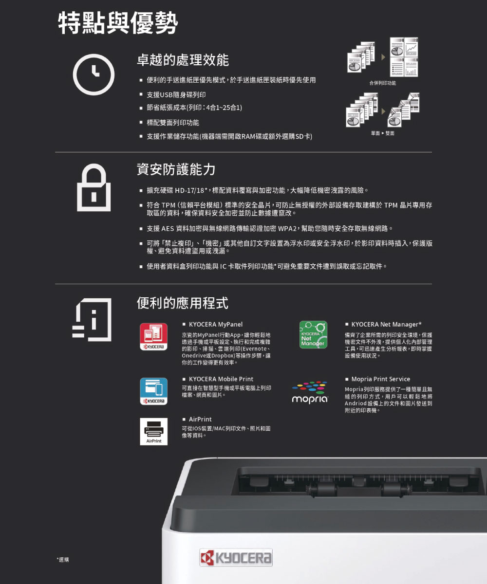 雙面列印|中文LCD螢幕(5行)|隨身碟列印|記憶體512mb