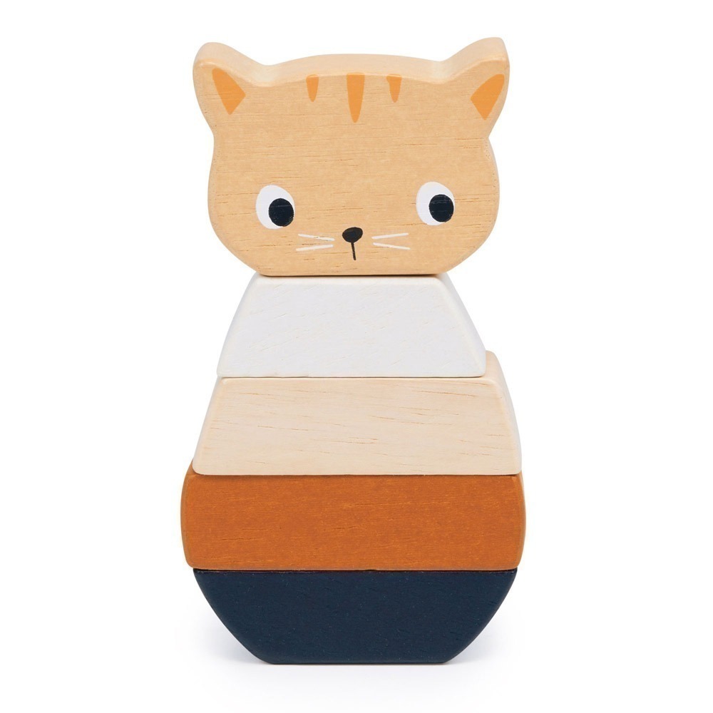 一個梯形底座,搭配4個不同顏色且可以任意移動的積木:3個梯形的積木和1個小貓造型的積木。疊疊樂過程可以訓練小肌肉,並提升抓握的平衡感和空間感的建立。