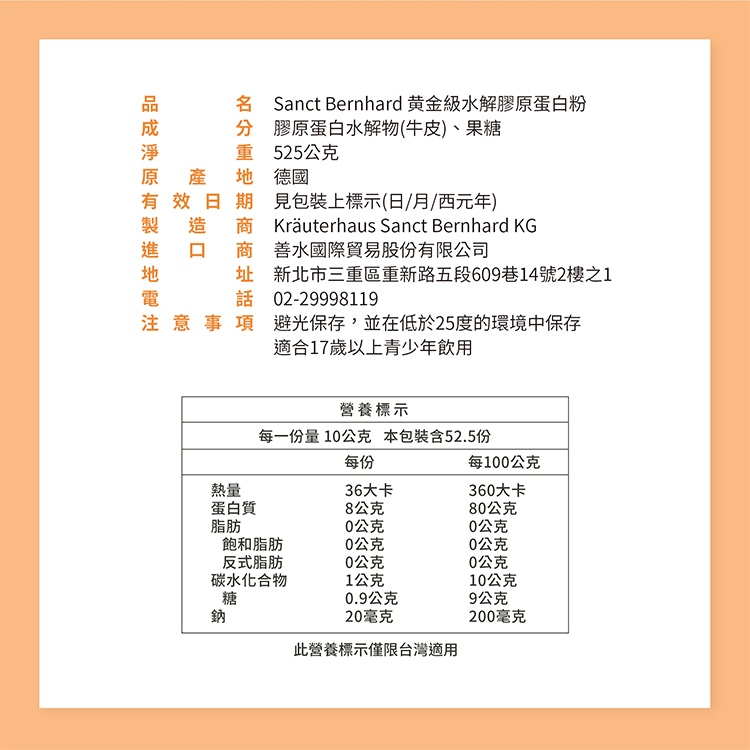 成分:水解膠原蛋白(90%),甜味劑果糖。