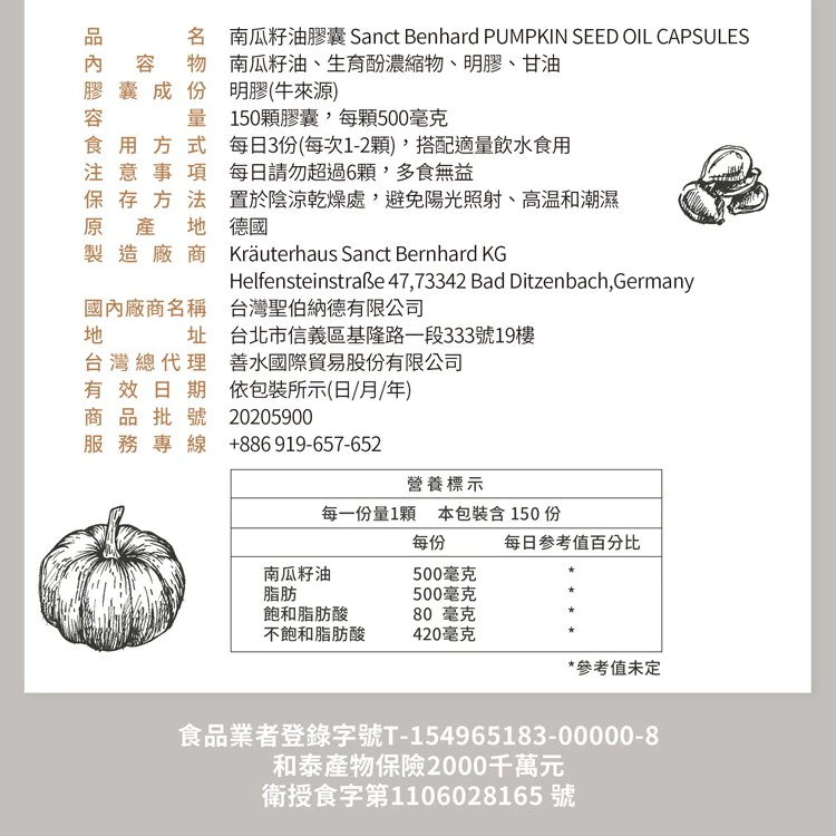每粒膠囊含有 500 毫克來自成熟南瓜種子的純南瓜籽油。